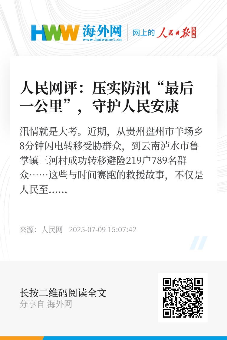 “宁可十防九空,不可失防万一。”唯有将责任链条延伸到每一个角落,把应急响应落实到每一个岗位,以“时时放心不下”的责任感和“事事落实到位”的执行力,才能在洪水来袭时,拥有足够的底气与能力守护家园,让人民群众在风雨中感受到实实在在的安全感。(孟哲)