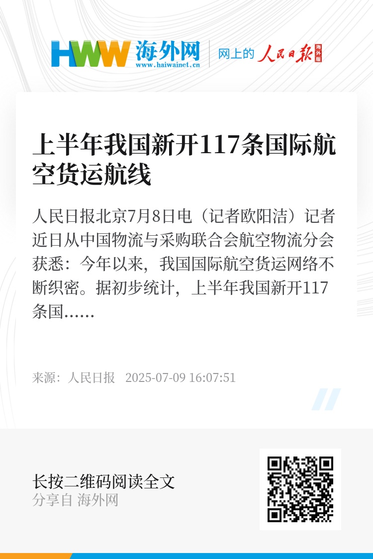 人民日报北京7月8日电(记者欧阳洁)记者近日从中国物流与采购联合会航空物流分会获悉:今年以来,我国国际航空货运网络不断织密。据初步统计,上半年我国新开117条国际航空货运航线,每周增加往返航班超过233个,同期航线数量同比增长58.1%。