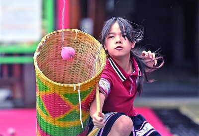 广西龙胜各族自治县龙胜镇第二小学,一名学生在大课间练习接绣球。新华社发