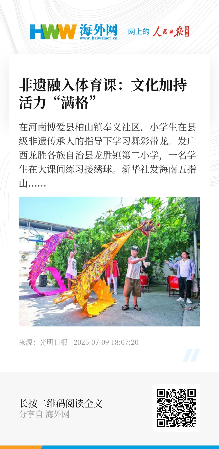 近年来,多地探索将非遗融入体育课。体育课不再只是增强体质的手段,更成为传承非遗的桥梁。非遗也不只是“进校园”,更是“在校园”。