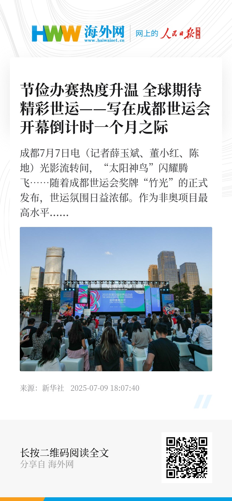 目前,成都世运会各项筹备工作已进入全面冲刺阶段。作为中国大陆首次举办的世运会,从“大运”到“世运”,成都秉承“办赛、营城、兴业、惠民”的理念,将向世界奉献一场兼具国际标准、中国风格、巴蜀韵味的体育盛会。