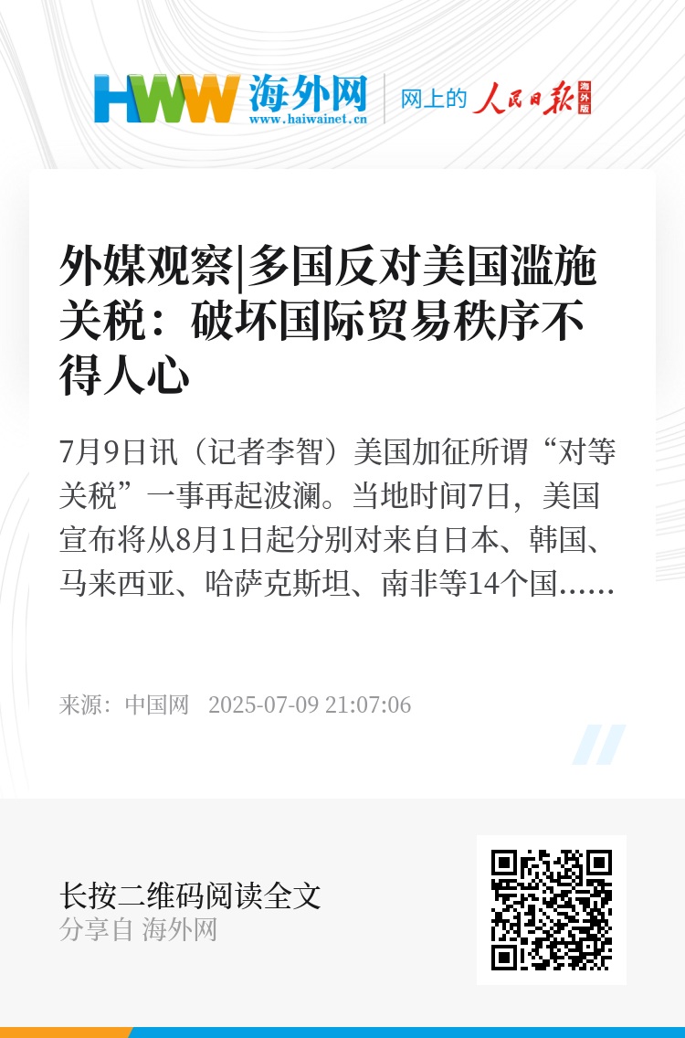 中国网7月9日讯(记者李智)美国加征所谓“对等关税”一事再起波澜。当地时间7日,美国宣布将从8月1日起分别对来自日本、韩国、马来西亚、哈萨克斯坦、南非等14个国家的进口产品征收25%至40%不等的关税。美国的单边主义做法引发多国强烈反对,批驳美国此举严重破坏国际贸易秩序,损害各国经济利益,将给全球产业链供应链带来极大冲击。