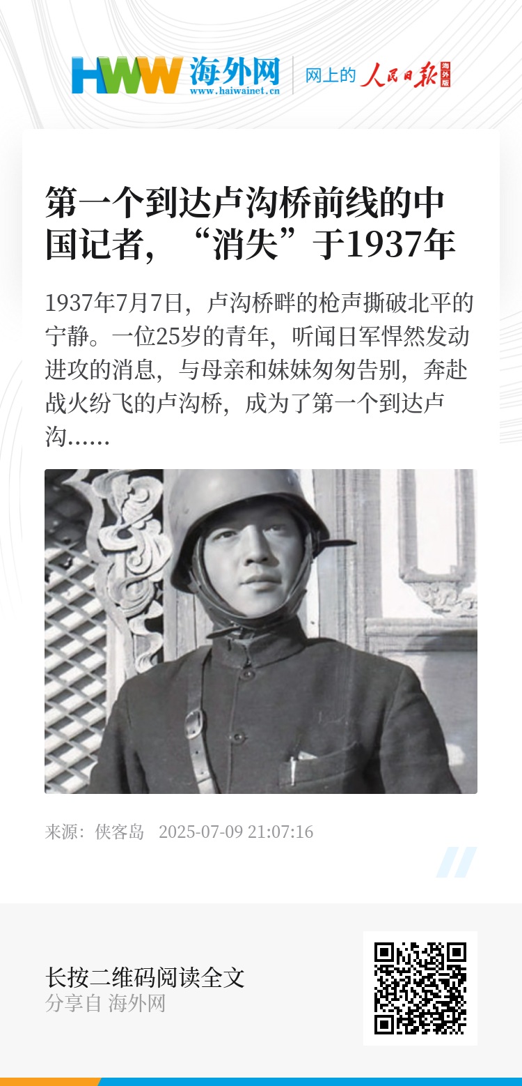 1937年7月7日,卢沟桥畔的枪声撕破北平的宁静。一位25岁的青年,听闻日军悍然发动进攻的消息,与母亲和妹妹匆匆告别,奔赴战火纷飞的卢沟桥,成为了第一个到达卢沟桥前线的中国记者。