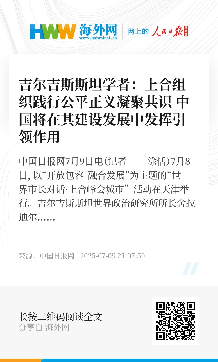 中国日报网7月9日电(记者 涂恬)7月8日,以“开放包容 融合发展”为主题的“世界市长对话·上合峰会城市”活动在天津举行。吉尔吉斯斯坦世界政治研究所所长舍拉迪尔•巴克特古洛夫在接受中国日报网记者专访时表示,上合组织堪称一个正向的典范,其通过的所有决定都基于成员国共识,成员无论国家大小均一视同仁,切实践行了公平正义,中国在推进上合组织发展以及成员国可持续发展中更是将发挥引领作用,助力可持续增长,惠及上合成员并将不断释放更广泛的影响力。(编辑 涂恬 刁云娇)