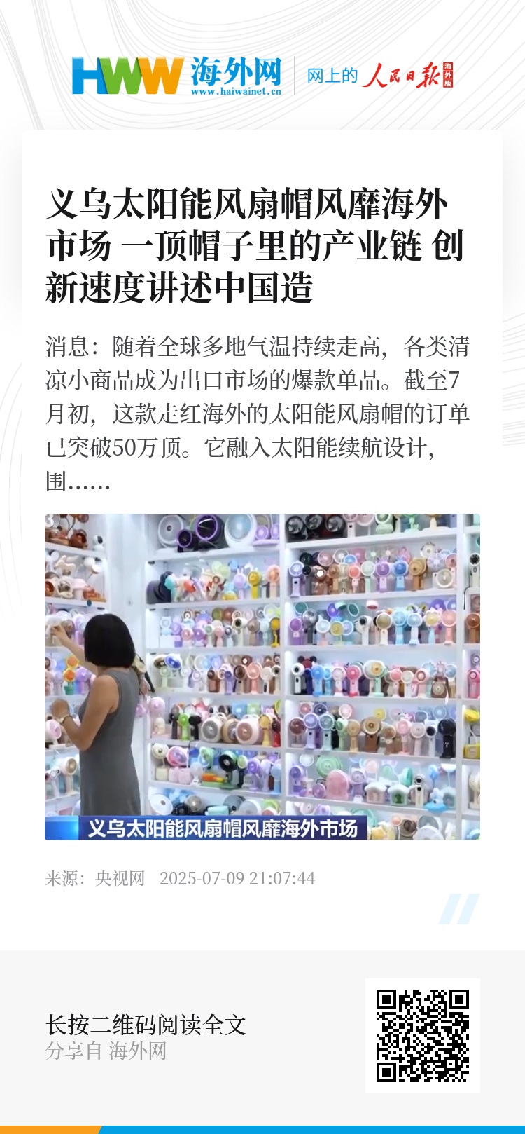 在浙江义乌,像太阳能风扇帽这样的“夏日爆款”还有很多。它们代表了一种新型“小而美”的中国造模式——以用户需求为导向,借助短视频平台快速“出圈”,在跨境电商的渠道实现高效转化,这种模式也被越来越多的中小企业复制和升级。依托完善的产业链和灵活的供应链体系,这里正不断孵化出新的全球热销单品。从“世界小商品之都”到“全球创意产品源头”,义乌制造正在加速转型,走向品牌化与国际化。