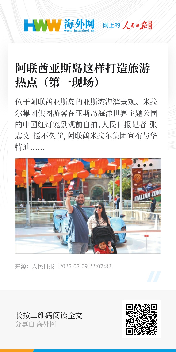 自2009年一级方程式赛车阿布扎比大奖赛在亚斯岛举行以来,多个全球“第一”“之最”在这个25平方公里的岛屿上诞生——世界第一个法拉利主题公园、世界第一家华纳兄弟主题酒店、全球最大室内海洋世界主题公园、全球最大的室内跳伞飞行室……在阿联酋经济多元化战略带动下,亚斯岛2024年接待游客超过3800万人次,成为全球知名的休闲旅游目的地之一。