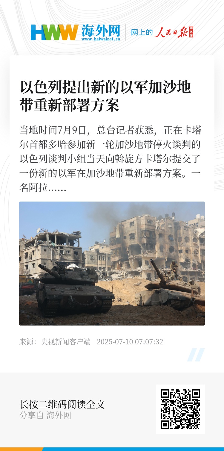 当地时间7月9日,总台记者获悉,正在卡塔尔首都多哈参加新一轮加沙地带停火谈判的以色列谈判小组当天向斡旋方卡塔尔提交了一份新的以军在加沙地带重新部署方案。