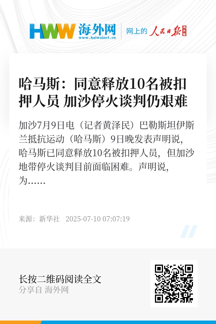 新华社加沙7月9日电(记者黄泽民)巴勒斯坦伊斯兰抵抗运动(哈马斯)9日晚发表声明说,哈马斯已同意释放10名被扣押人员,但加沙地带停火谈判目前面临困难。