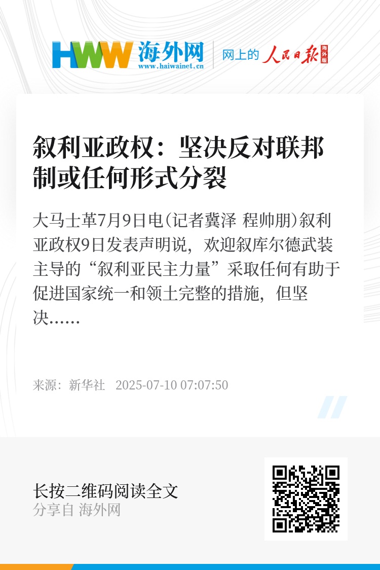 新华社大马士革7月9日电(记者冀泽 程帅朋)叙利亚政权9日发表声明说,欢迎叙库尔德武装主导的“叙利亚民主力量”采取任何有助于促进国家统一和领土完整的措施,但坚决反对联邦制或者任何形式的分裂活动。