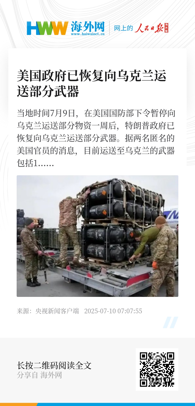 当地时间7月9日,在美国国防部下令暂停向乌克兰运送部分物资一周后,特朗普政府已恢复向乌克兰运送部分武器。