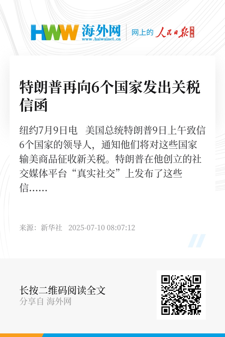 特朗普在他创立的社交媒体平台“真实社交”上发布了这些信函。这6个国家包括菲律宾、文莱、摩尔多瓦、阿尔及利亚、伊拉克和利比亚。其中,利比亚、伊拉克和阿尔及利亚将被征收30%的关税,文莱和摩尔多瓦的税率是25%,菲律宾的税率是20%。新税率将从8月1日起生效。