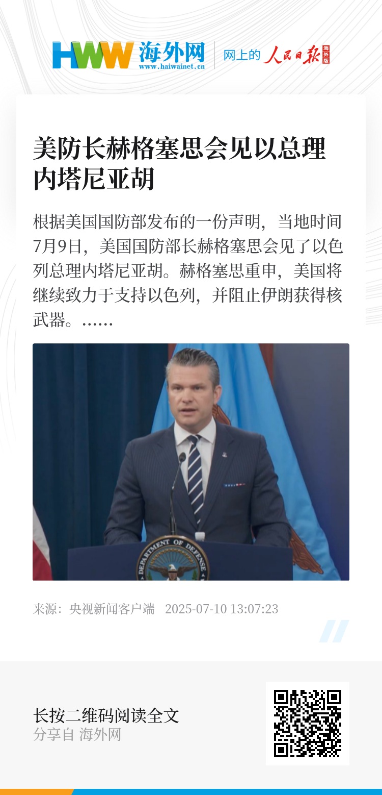 根据美国国防部发布的一份声明,当地时间7月9日,美国国防部长赫格塞思会见了以色列总理内塔尼亚胡。