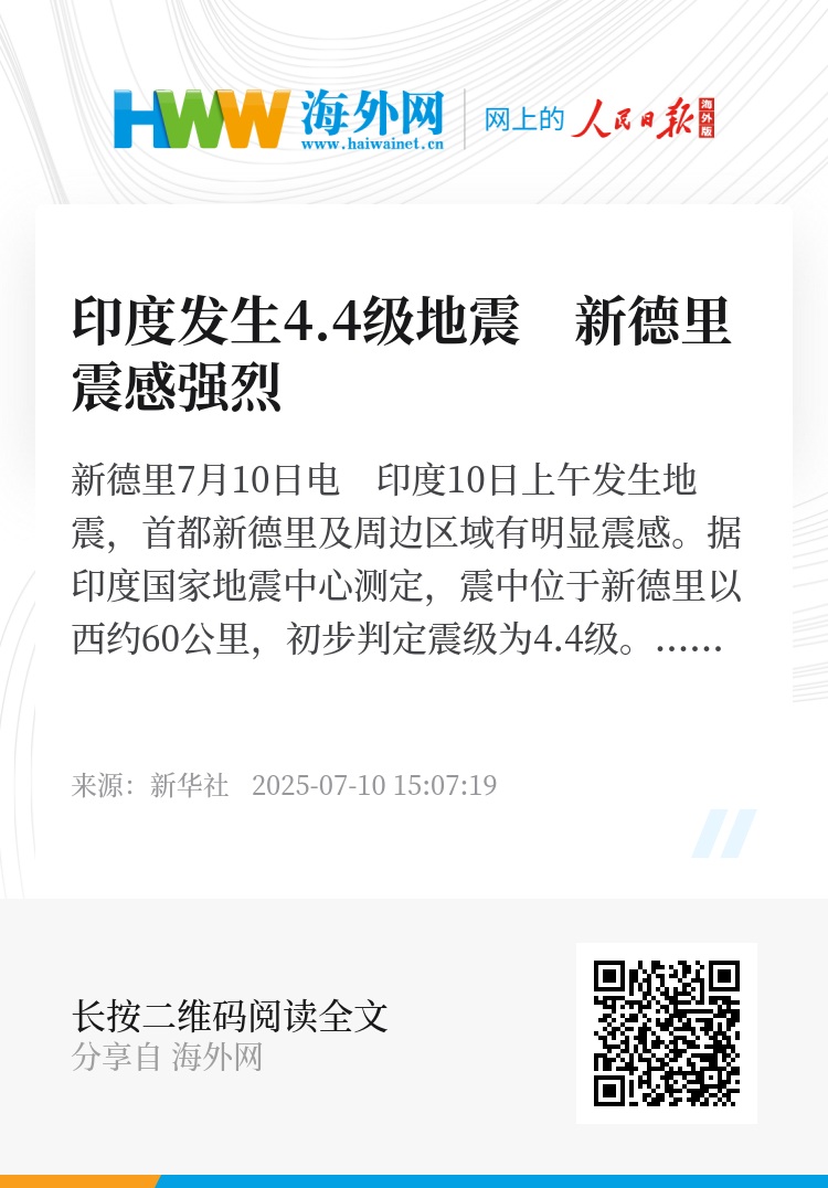 新华社新德里7月10日电 印度10日上午发生地震,首都新德里及周边区域有明显震感。据印度国家地震中心测定,震中位于新德里以西约60公里,初步判定震级为4.4级。
