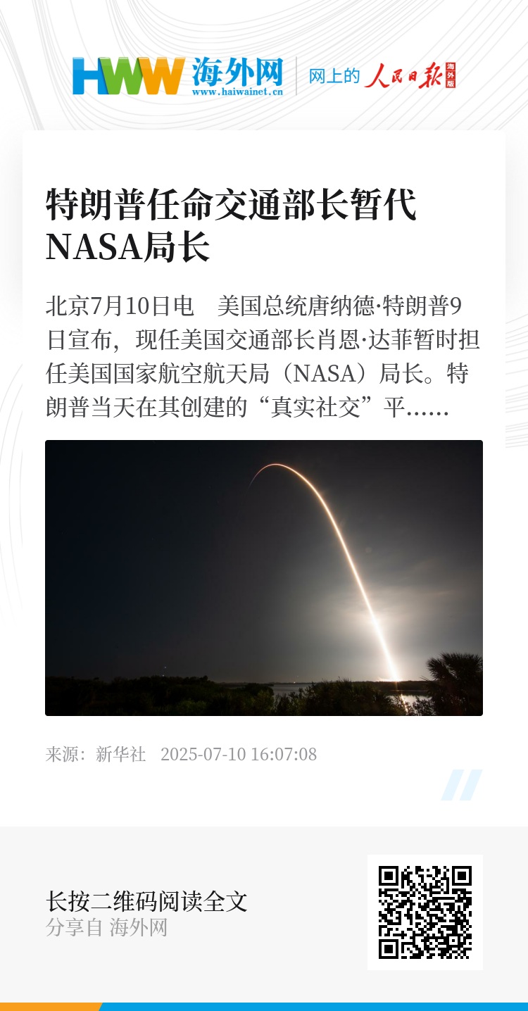 新华社北京7月10日电 美国总统唐纳德·特朗普9日宣布,现任美国交通部长肖恩·达菲暂时担任美国国家航空航天局(NASA)局长。