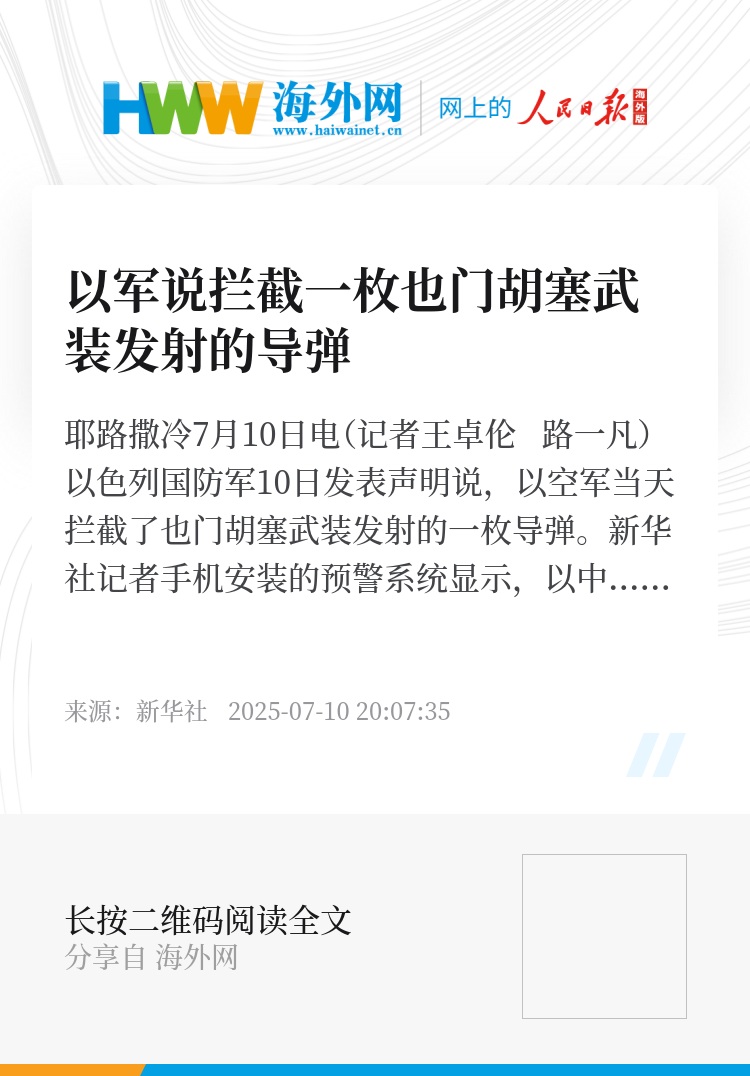 新华社耶路撒冷7月10日电(记者王卓伦 路一凡)以色列国防军10日发表声明说,以空军当天拦截了也门胡塞武装发射的一枚导弹。
