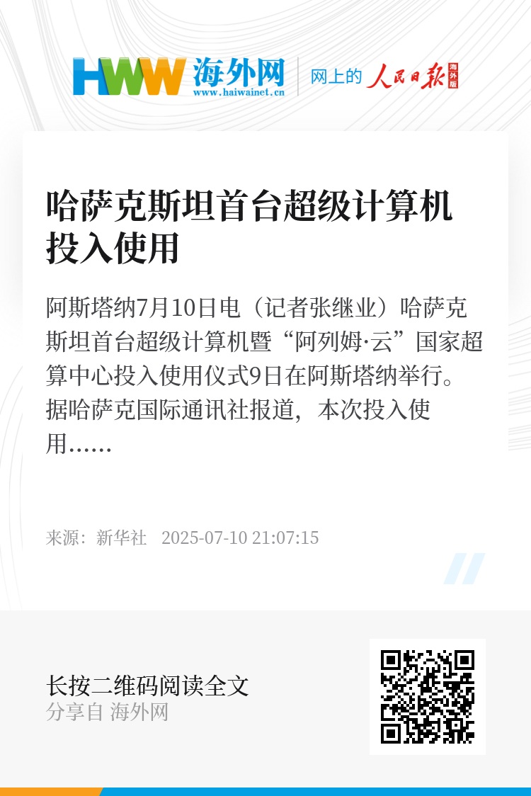 新华社阿斯塔纳7月10日电(记者张继业)哈萨克斯坦首台超级计算机暨“阿列姆·云”国家超算中心投入使用仪式9日在阿斯塔纳举行。