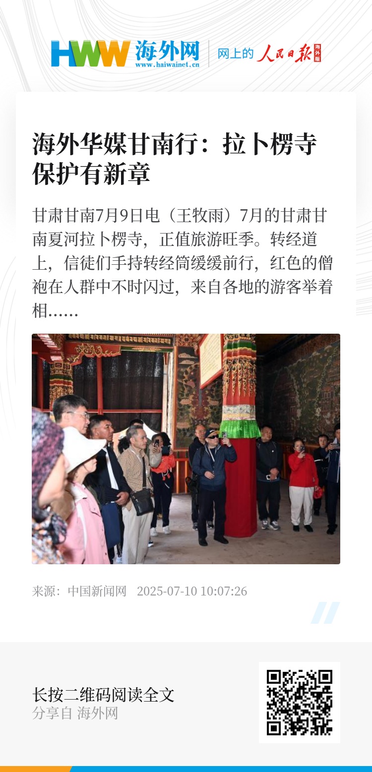 8日,2025海外华文媒体甘南行活动启动,来自法国、加拿大、日本等12个国家和地区的18家海外华文媒体代表参加。当日,采访团一行走进这座有三百余年历史的藏传佛教名刹,实地探访其在旅游热潮中如何保护文物。