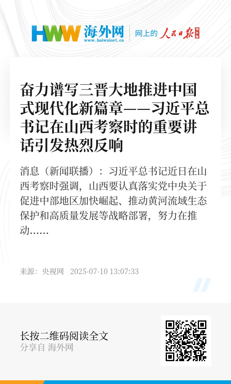 央视网消息(新闻联播):习近平总书记近日在山西考察时强调,山西要认真落实党中央关于促进中部地区加快崛起、推动黄河流域生态保护和高质量发展等战略部署,努力在推动资源型经济转型发展上迈出新步伐,奋力谱写三晋大地推进中国式现代化新篇章。广大干部群众表示,要认真贯彻总书记重要讲话精神,传承弘扬伟大抗战精神,凝心聚力、接续奋斗,在中国式现代化建设中展现更大作为。