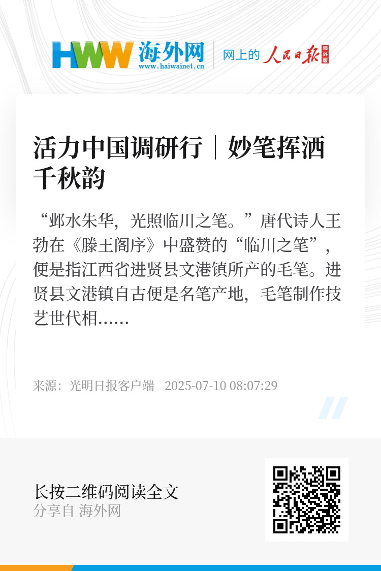 据了解,近年来,进贤县多维度做好“笔”文章,推动毛笔文化创造性转化、创新性发展。目前文港镇有从事毛笔生产营销的企业400余家、作坊2200余家,从业人员2.2万余人。文港镇推动文化和旅游深度融合发展,先后建成中国毛笔文化博物馆、钢笔文化博物馆等一批特色旅游景点,按照“前店后坊”模式,打造文化产业街区,并举办毛笔制作职业技能大赛、毛笔书法进校园等活动,形成了独具特色的区域文旅品牌。2024年,文港镇接待游客17.2万人次,实现旅游综合收入6500万元。文港毛笔的千年传奇,正在传承和发扬中续写新篇。(光明日报全媒体记者安胜蓝、胡晓军、王洋)