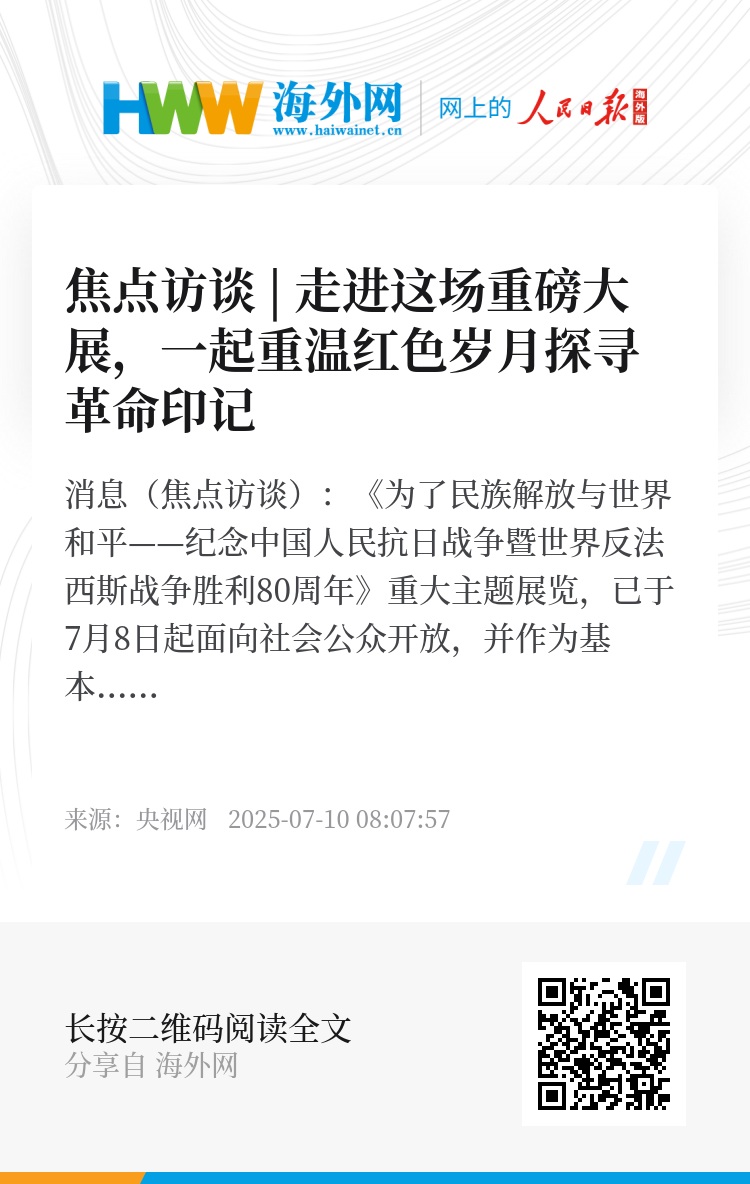 央视网消息(焦点访谈):《为了民族解放与世界和平——纪念中国人民抗日战争暨世界反法西斯战争胜利80周年》重大主题展览,已于7月8日起面向社会公众开放,并作为基本陈列长期展出。习近平总书记强调:“伟大抗战精神,是中国人民弥足珍贵的精神财富,将永远激励中国人民克服一切艰难险阻、为实现中华民族伟大复兴而奋斗。”抗日战争时期,广大青年与其他抗日军民一道,以“天下兴亡、匹夫有责的爱国情怀,视死如归、宁死不屈的民族气节,不畏强暴、血战到底的英雄气概,百折不挠、坚忍不拔的必胜信念”铸就、诠释了伟大抗战精神。在展览向公众开放前,记者提前走进展馆,感受抗战中的青春故事。