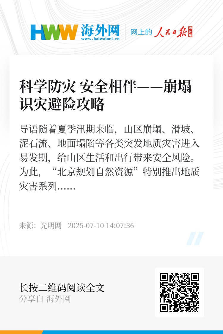 随着夏季汛期来临,山区崩塌、滑坡、泥石流、地面塌陷等各类突发地质灾害进入易发期,给山区生活和出行带来安全风险。为此,“北京规划自然资源”特别推出地质灾害系列识灾避险攻略,邀您一起解锁科学识灾、高效防灾、正确避险的关键技能,共同筑牢安全防线,守护平安家园。