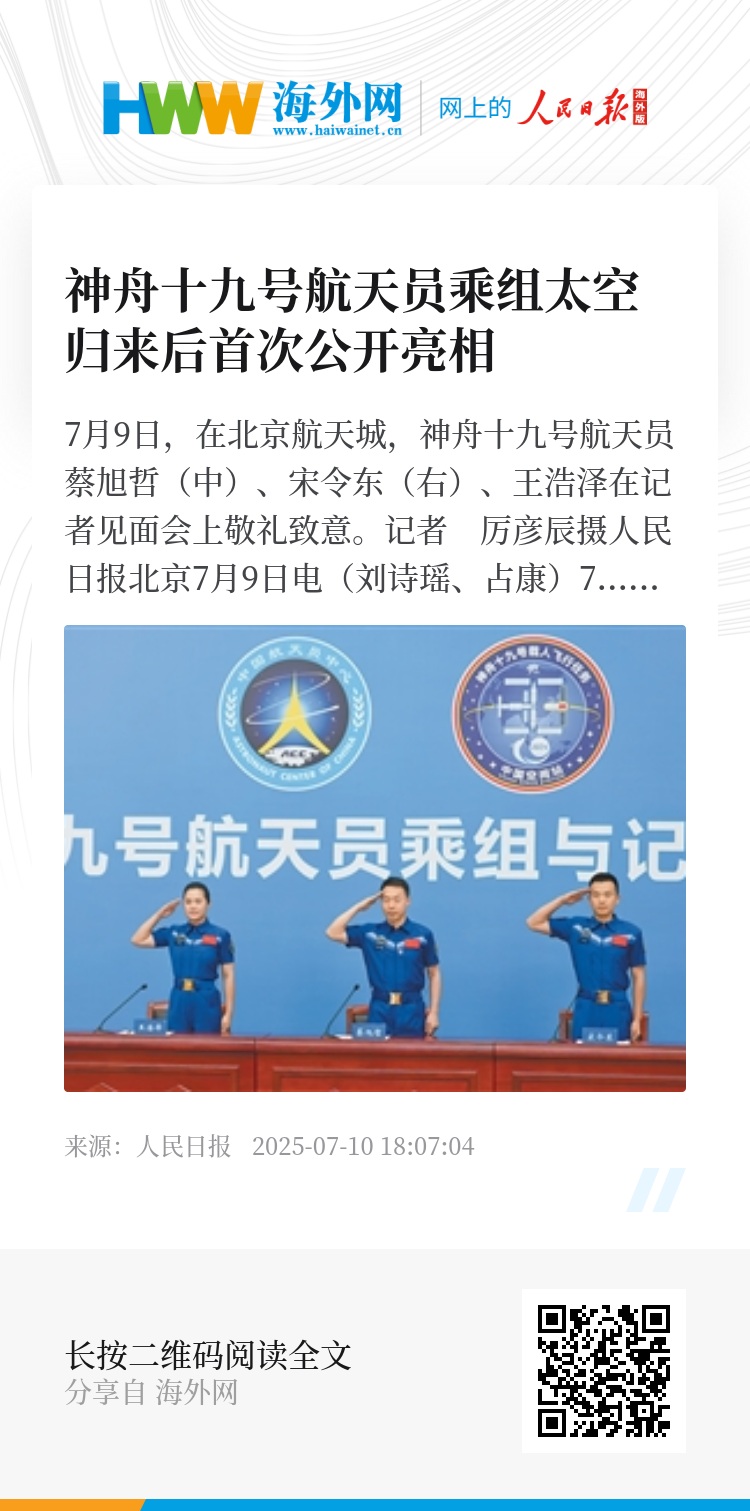 人民日报北京7月9日电(刘诗瑶、占康)7月9日下午,中国航天员科研训练中心在北京航天城举行神舟十九号乘组与记者见面会。这是航天员蔡旭哲、宋令东、王浩泽返回两个多月后,首次面向媒体与公众正式公开亮相,并分享了183天太空驻留的经历与感悟。