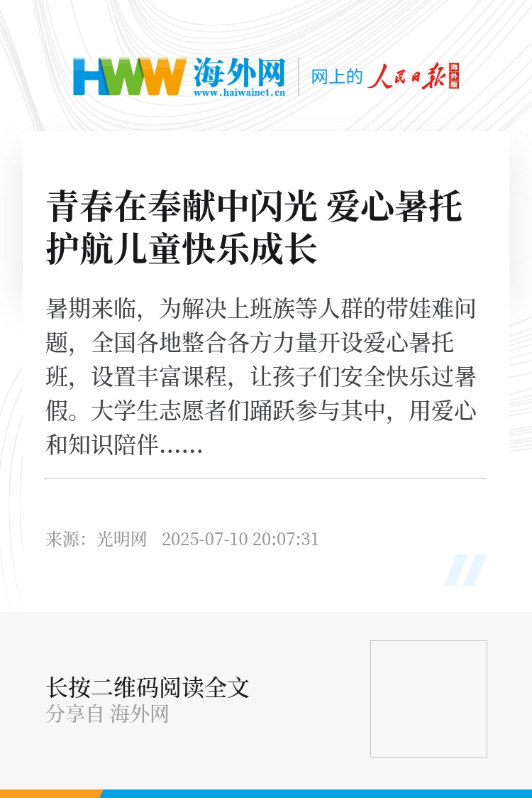 暑期来临,为解决上班族等人群的带娃难问题,全国各地整合各方力量开设爱心暑托班,设置丰富课程,让孩子们安全快乐过暑假。大学生志愿者们踊跃参与其中,用爱心和知识陪伴孩子,大家一起开心过暑假。在丰富多彩的活动中,大学生带动小学生,让知识实现快乐传递,助力少年儿童在快乐中求知成长。