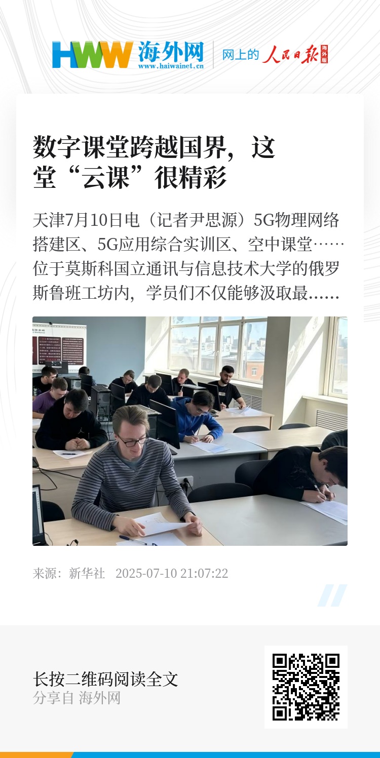 新华社天津7月10日电(记者尹思源)5G物理网络搭建区、5G应用综合实训区、空中课堂……位于莫斯科国立通讯与信息技术大学的俄罗斯鲁班工坊内,学员们不仅能够汲取最前沿的数字技术知识,还能通过项目实操,不断提升自己的动手能力和解决实际问题的能力。