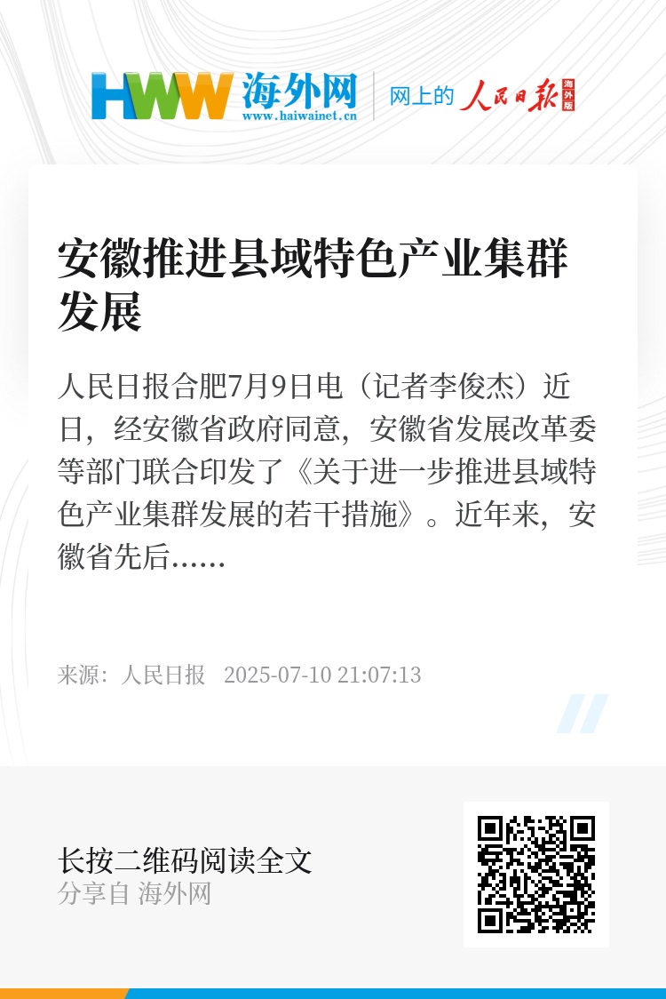人民日报合肥7月9日电(记者李俊杰)近日,经安徽省政府同意,安徽省发展改革委等部门联合印发了《关于进一步推进县域特色产业集群发展的若干措施》。