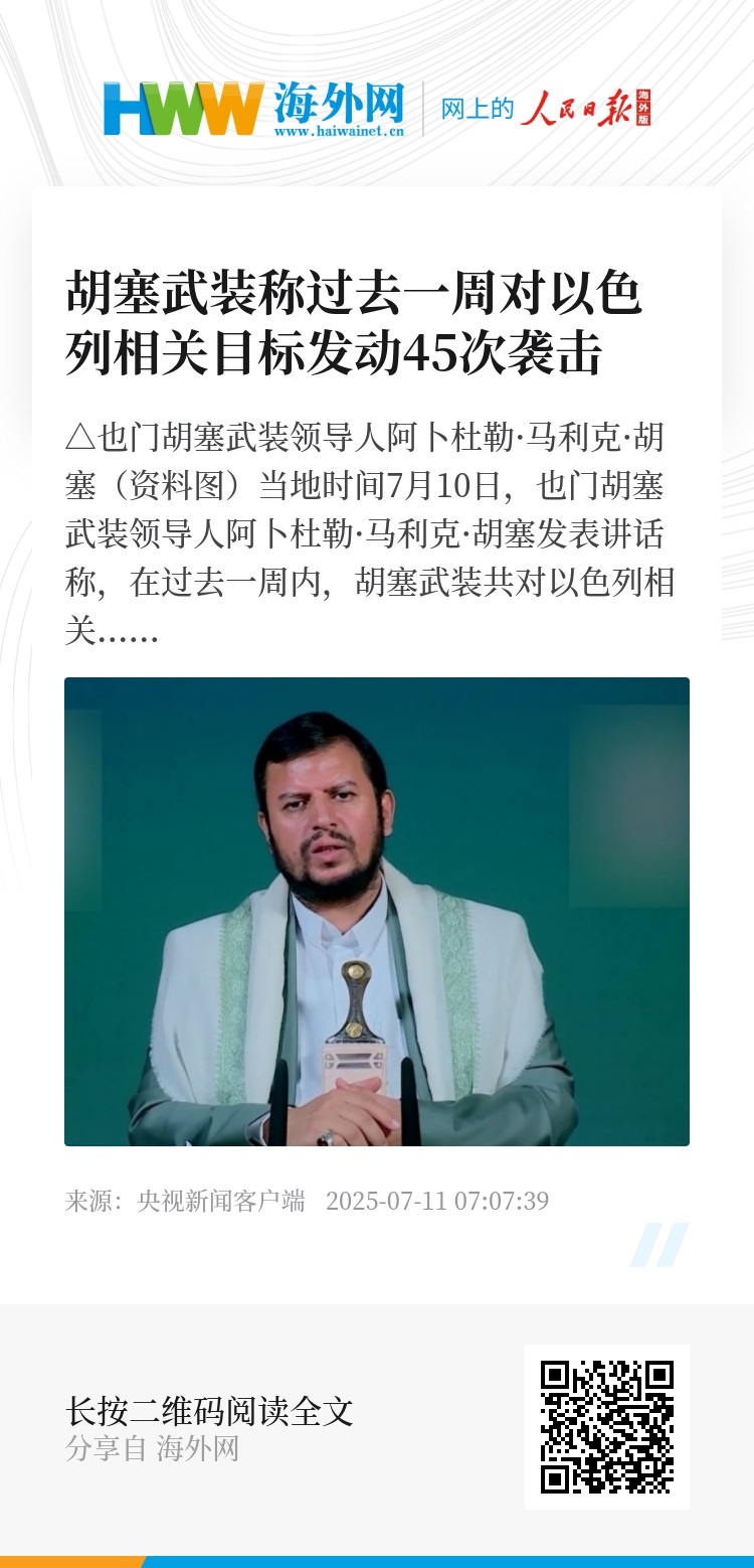 当地时间7月10日,也门胡塞武装领导人阿卜杜勒·马利克·胡塞发表讲话称,在过去一周内,胡塞武装共对以色列相关目标发起了45次袭击,使用了包括高超音速导弹、弹道导弹、无人机、军事快艇等武器。