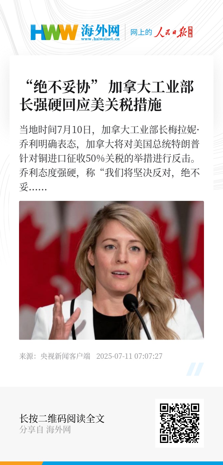 当地时间7月10日,加拿大工业部长梅拉妮·乔利明确表态,加拿大将对美国总统特朗普针对铜进口征收50%关税的举措进行反击。乔利态度强硬,称“我们将坚决反对,绝不妥协”,不过她并未透露具体的反击细节。