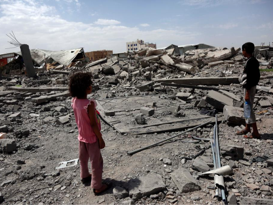 4月27日,在也门首都萨那,孩子们站在美军空袭后的废墟上。新华社发(穆罕默德·穆罕默德摄)