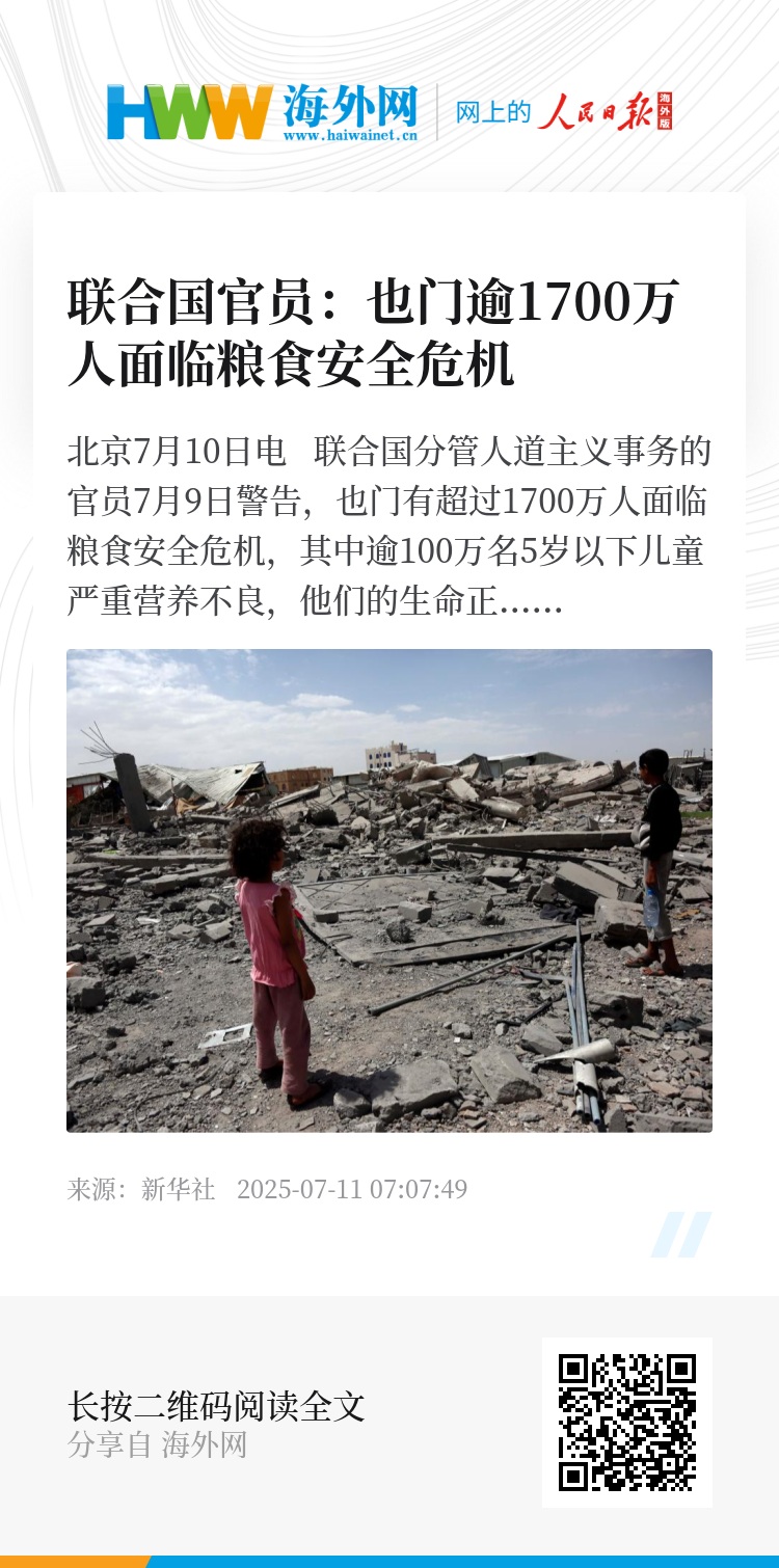 新华社北京7月10日电 联合国分管人道主义事务的官员7月9日警告,也门有超过1700万人面临粮食安全危机,其中逾100万名5岁以下儿童严重营养不良,他们的生命正受到威胁。