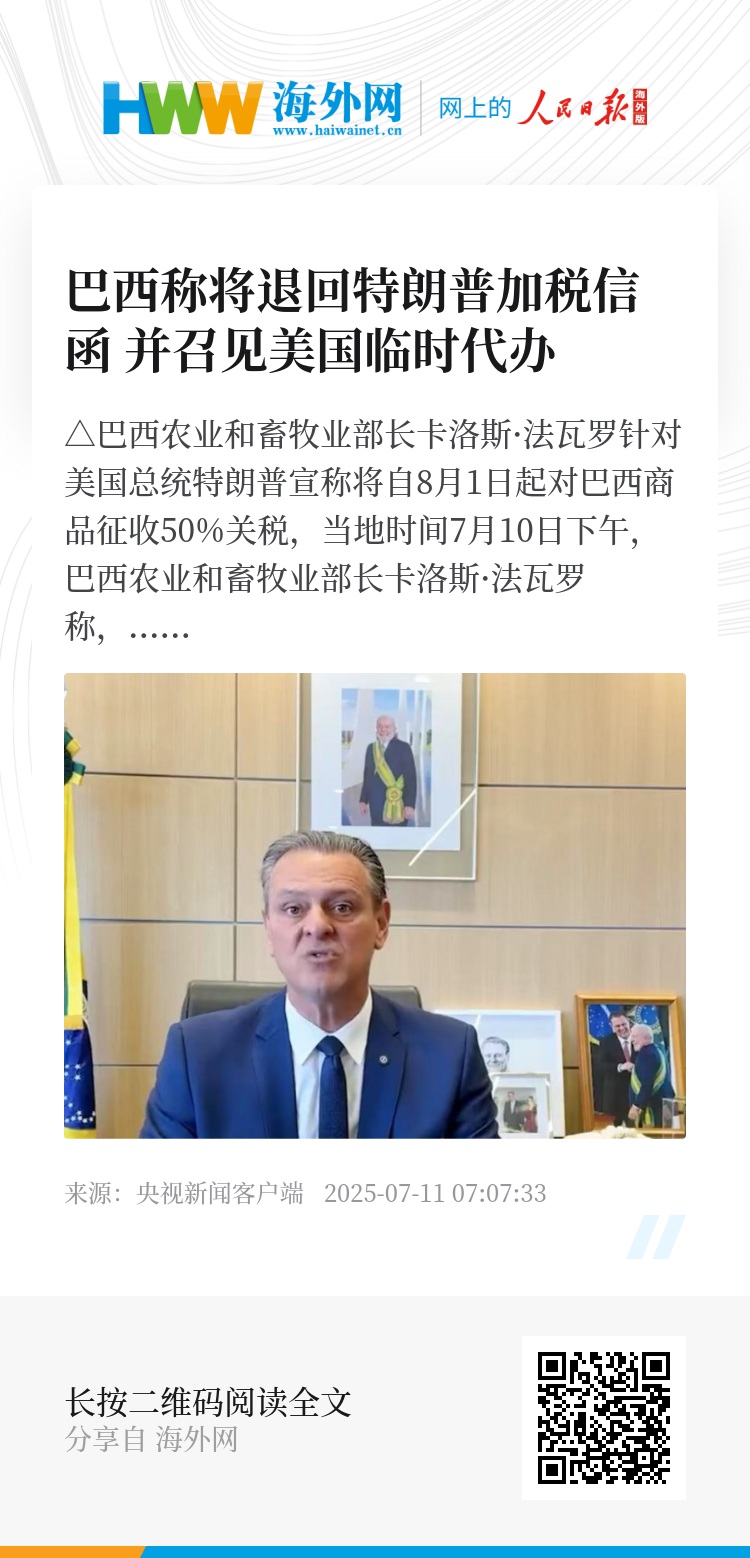 针对美国总统特朗普宣称将自8月1日起对巴西商品征收50%关税,当地时间7月10日下午,巴西农业和畜牧业部长卡洛斯·法瓦罗称,美国政府对巴西出口产品征收50%关税是“不正当举措”。法瓦罗表示,将着眼于中东、南亚等具有巨大消费潜力的重要市场,它们可以成为巴西出口的替代选项。