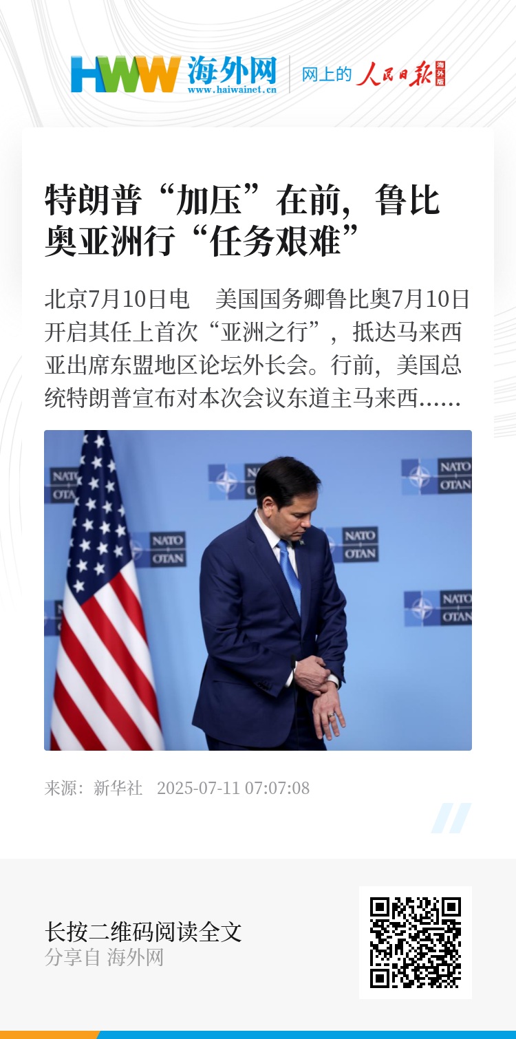 新华社北京7月10日电 美国国务卿鲁比奥7月10日开启其任上首次“亚洲之行”,抵达马来西亚出席东盟地区论坛外长会。行前,美国总统特朗普宣布对本次会议东道主马来西亚以及多个参会国家征收关税的税率。美国媒体报道称,这可能会给鲁比奥此行“蒙上阴影”,恐难有成果。