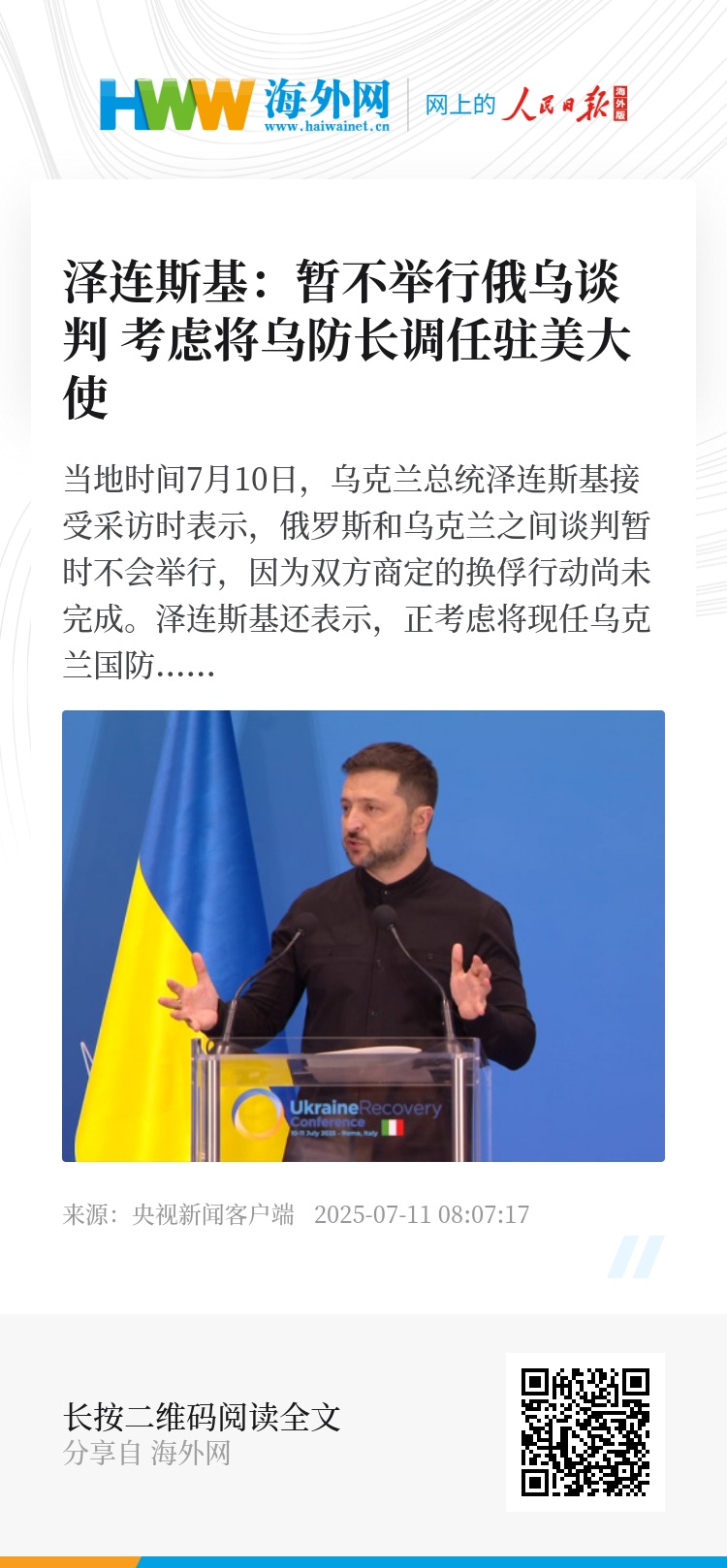 泽连斯基还表示,正考虑将现任乌克兰国防部长乌梅罗夫调任驻美大使一职。他表示,近期肯定会更换乌克兰驻美大使。