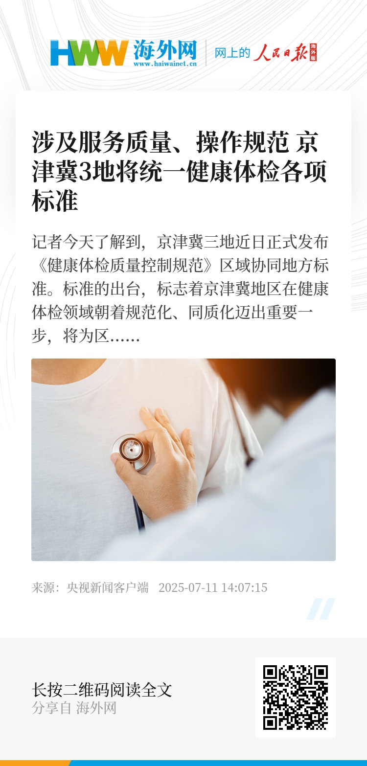 记者今天了解到,京津冀三地近日正式发布《健康体检质量控制规范》区域协同地方标准。标准的出台,标志着京津冀地区在健康体检领域朝着规范化、同质化迈出重要一步,将为区域内广大民众提供更加优质、可靠的健康体检服务。