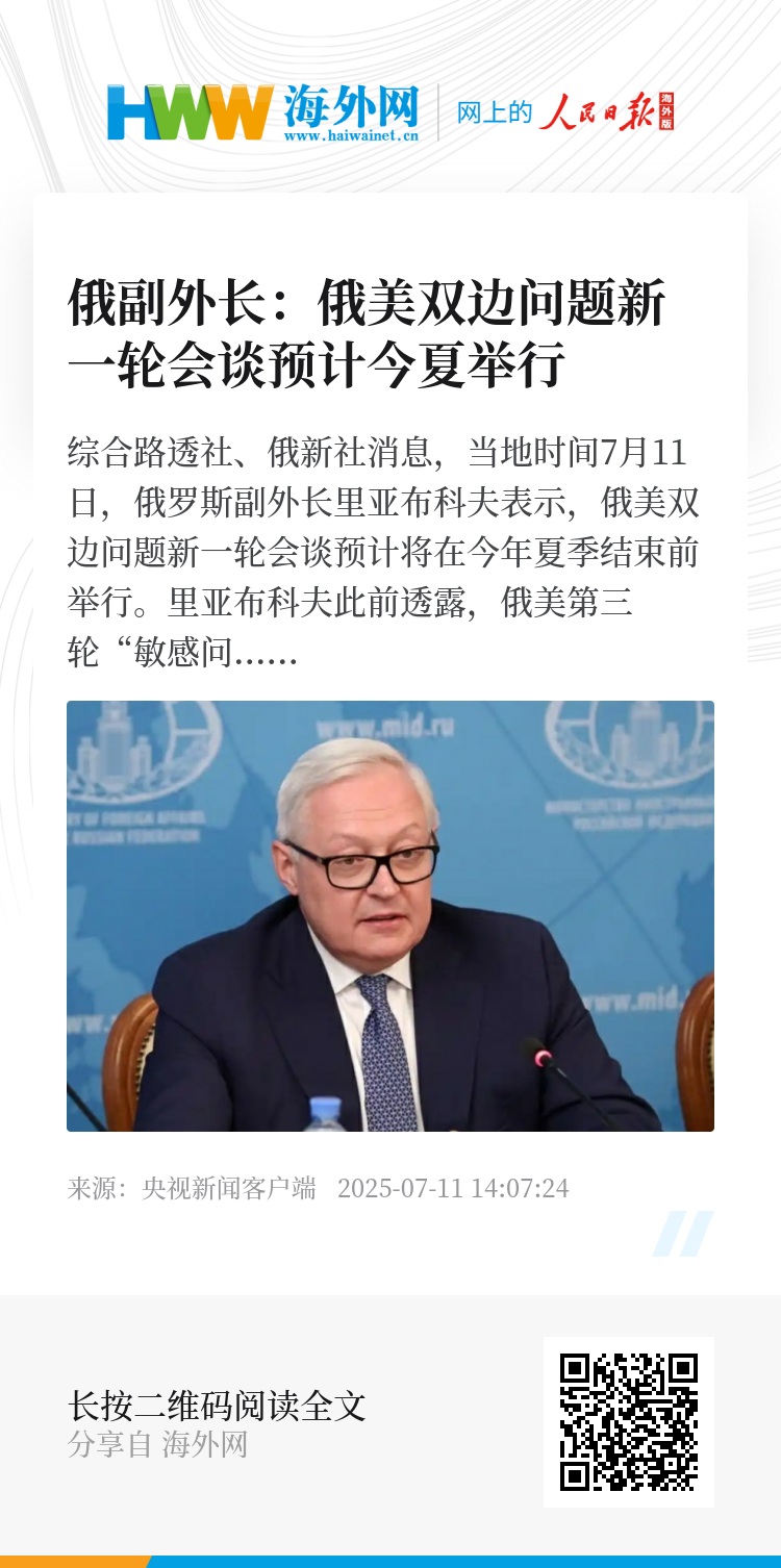 综合路透社、俄新社消息,当地时间7月11日,俄罗斯副外长里亚布科夫表示,俄美双边问题新一轮会谈预计将在今年夏季结束前举行。