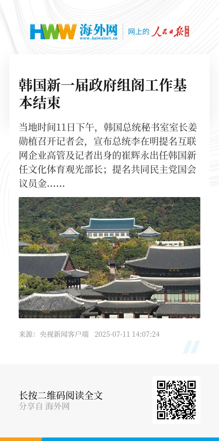至此,韩国新一届政府各部长遴选工作已接近尾声,相关提名人在经过韩国国会人事听证会后将正式获得任命。(总台记者 唐鑫)