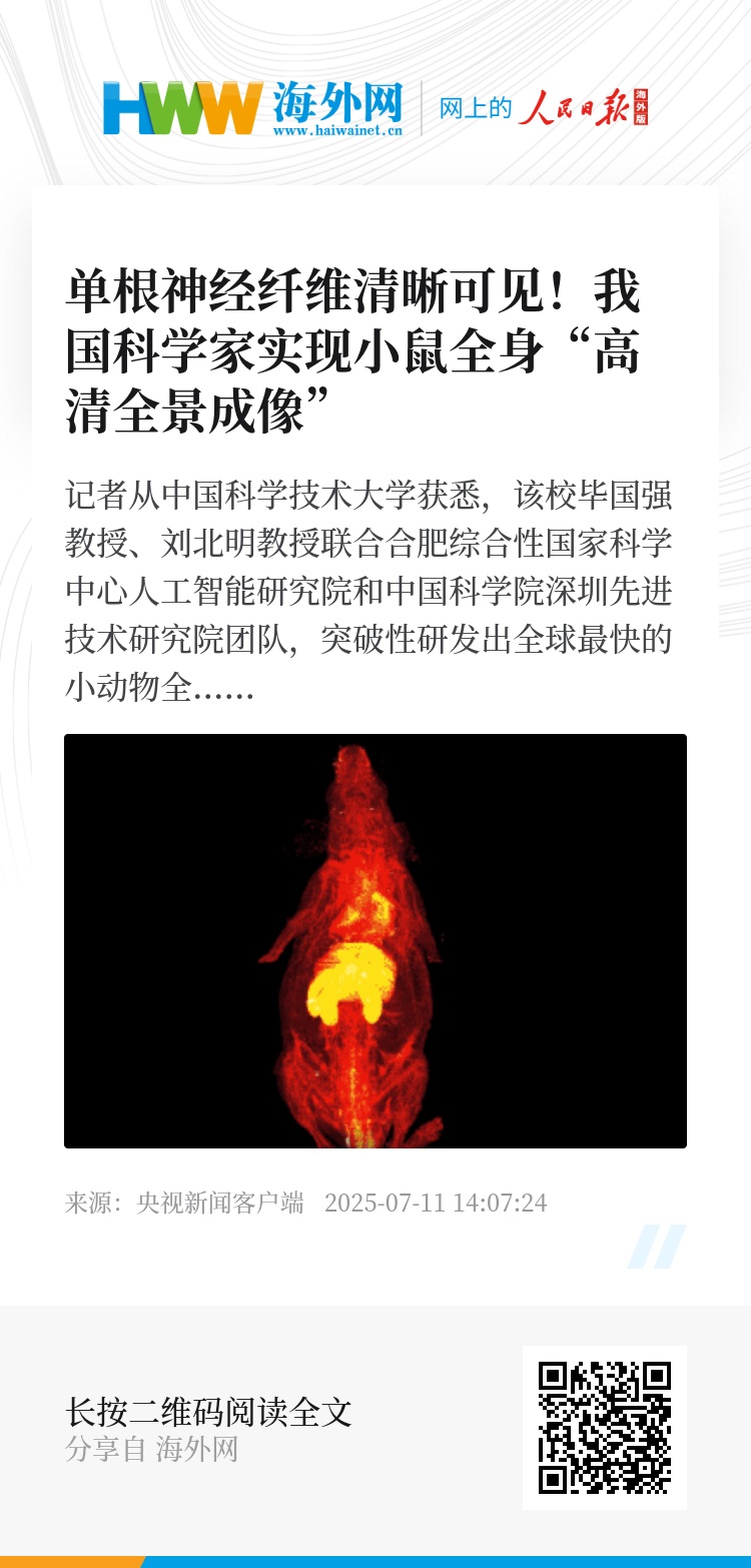记者从中国科学技术大学获悉,该校毕国强教授、刘北明教授联合合肥综合性国家科学中心人工智能研究院和中国科学院深圳先进技术研究院团队,突破性研发出全球最快的小动物全身亚细胞分辨率三维成像技术,首次实现小鼠全身神经网络精细三维图谱高清绘制。相关成果于北京时间7月10日发表于国际学术期刊《细胞》(Cell),为解析周围神经调控网络及疾病机理研究提供了全新工具。