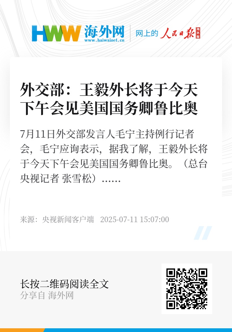 7月11日外交部发言人毛宁主持例行记者会,毛宁应询表示,据我了解,王毅外长将于今天下午会见美国国务卿鲁比奥。