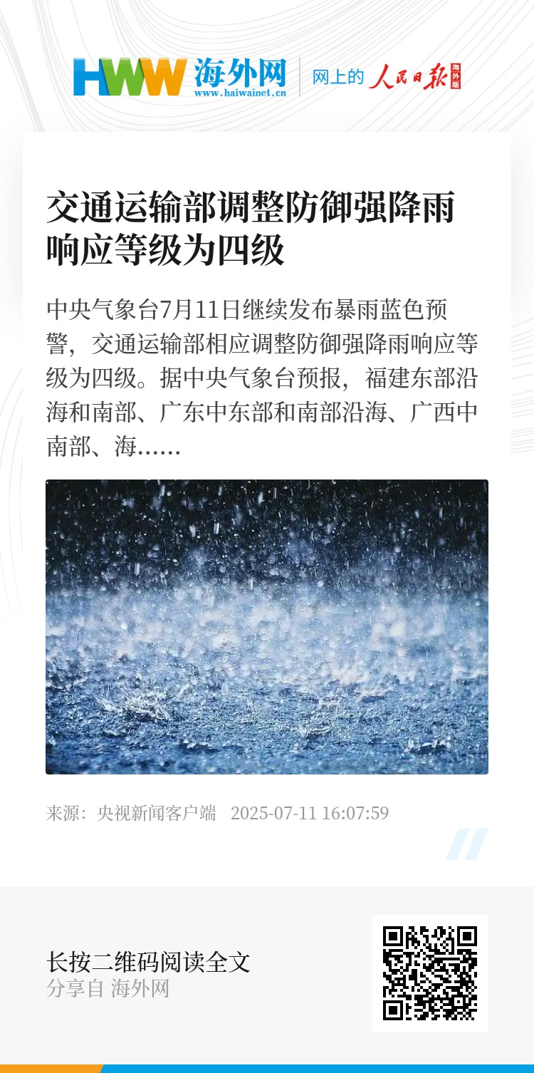 中央气象台7月11日继续发布暴雨蓝色预警,交通运输部相应调整防御强降雨响应等级为四级。据中央气象台预报,福建东部沿海和南部、广东中东部和南部沿海、广西中南部、海南岛北部、云南中南部、四川盆地南部、江西南部、湖南南部、江苏南部、安徽中部、浙江北部、上海、内蒙古中部、黑龙江中西部、新疆西南部等地部分地区有大到暴雨,其中,广东东部和沿海、福建东南部、江西南部等地部分地区有大暴雨。