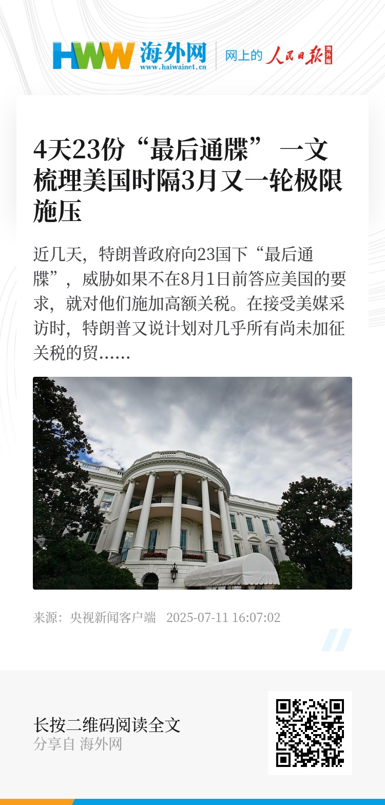 近几天,特朗普政府向23国下“最后通牒”,威胁如果不在8月1日前答应美国的要求,就对他们施加高额关税。在接受美媒采访时,特朗普又说计划对几乎所有尚未加征关税的贸易伙伴征收15%或20%的统一关税。