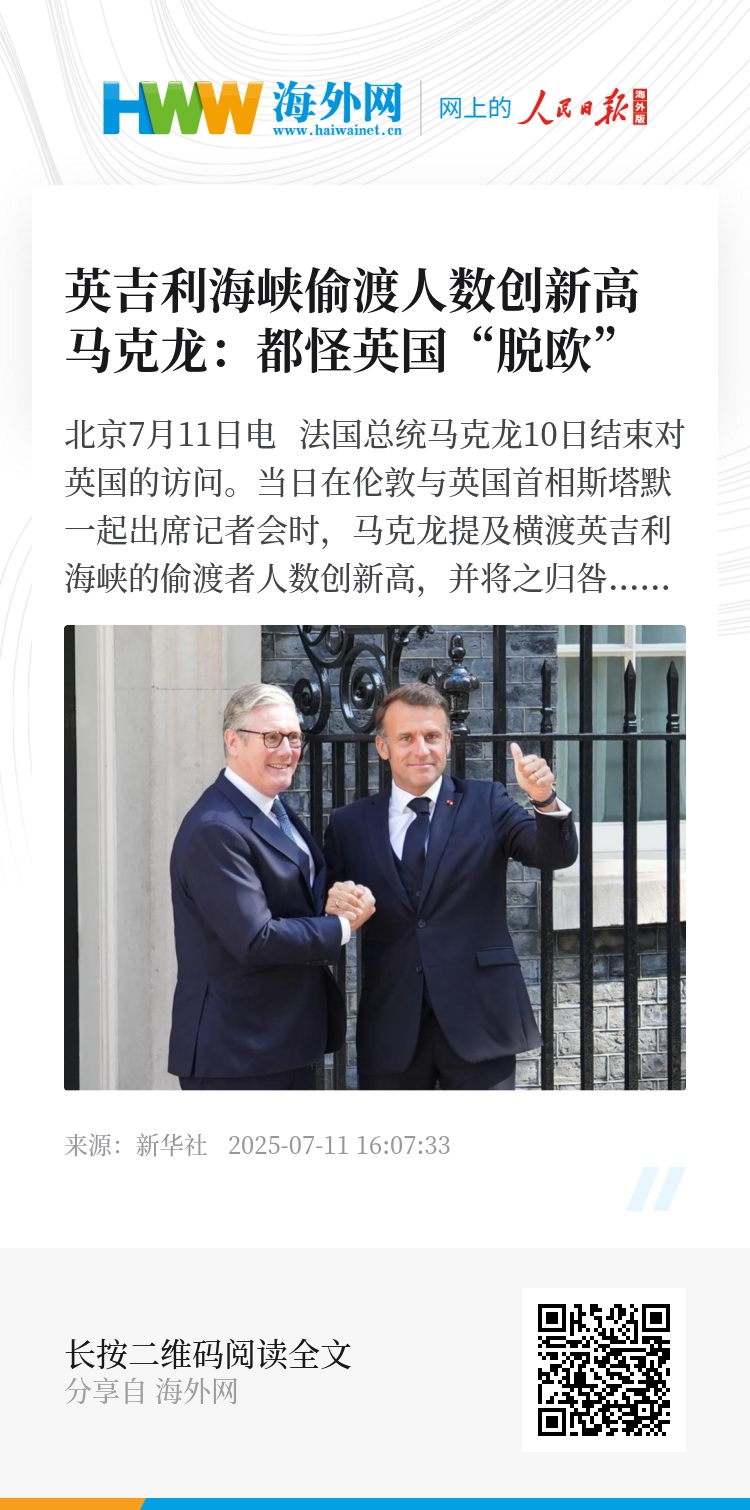 新华社北京7月11日电 法国总统马克龙10日结束对英国的访问。当日在伦敦与英国首相斯塔默一起出席记者会时,马克龙提及横渡英吉利海峡的偷渡者人数创新高,并将之归咎于英国“脱欧”。