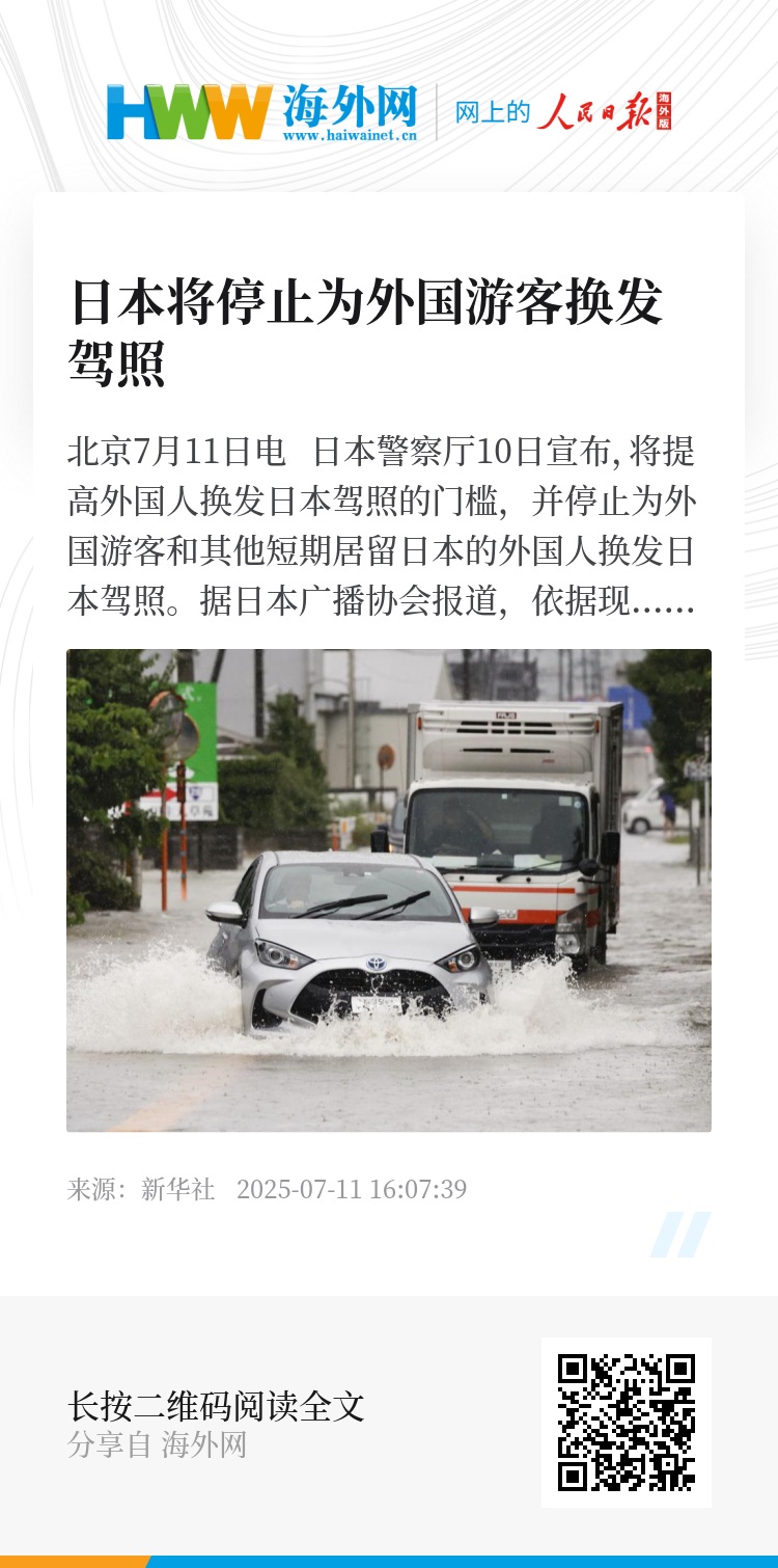 新华社北京7月11日电 日本警察厅10日宣布,将提高外国人换发日本驾照的门槛,并停止为外国游客和其他短期居留日本的外国人换发日本驾照。
