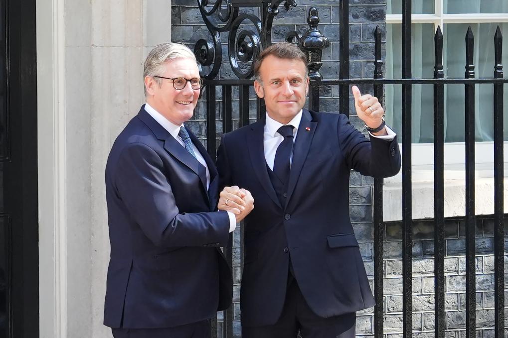 7月10日,在英国伦敦唐宁街10号首相府前,英国首相斯塔默(左)与法国总统马克龙握手。新华社记者吴鲁摄