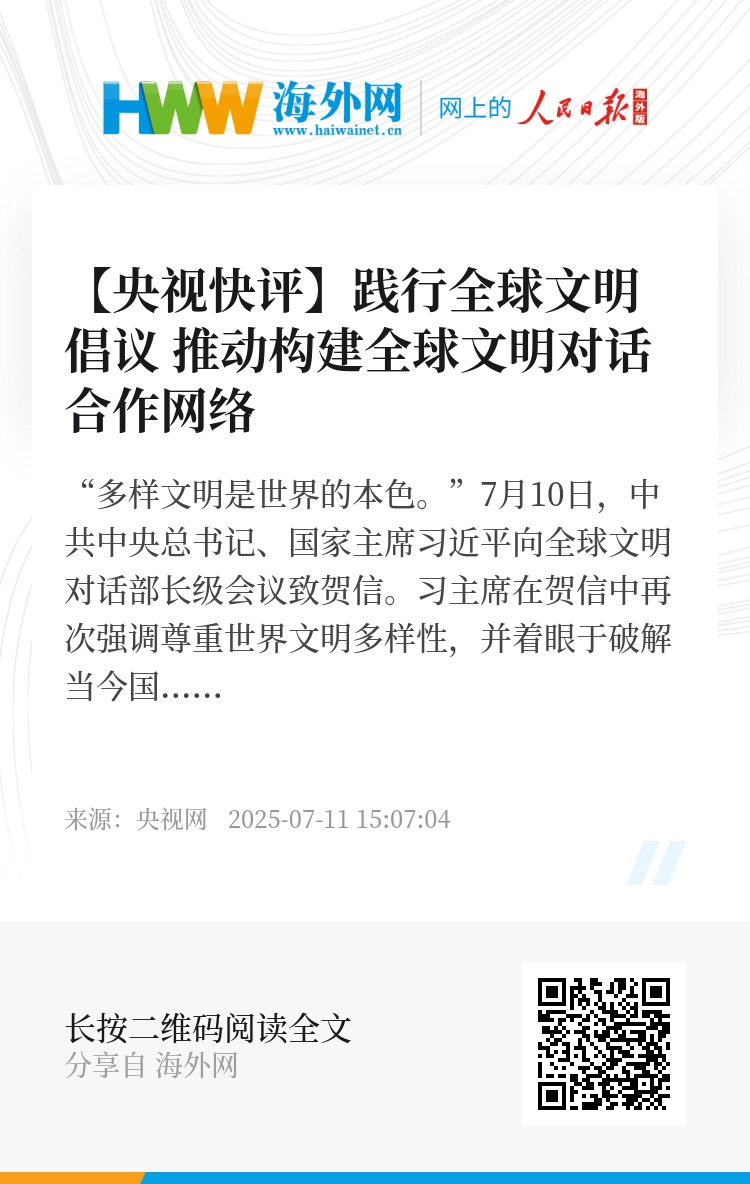 “多样文明是世界的本色。”7月10日,中共中央总书记、国家主席习近平向全球文明对话部长级会议致贺信。习主席在贺信中再次强调尊重世界文明多样性,并着眼于破解当今国际社会的深层矛盾与发展困局,深刻阐明了文明交流互鉴对于文明发展和人类进步的重要性,表达了中国深入推动文明交流互鉴、同世界携手并进的诚挚意愿。