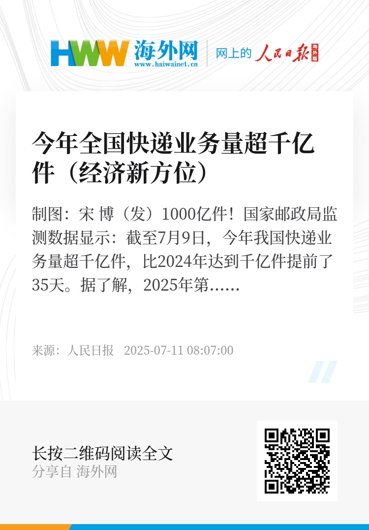 国家邮政局监测数据显示:截至7月9日,今年我国快递业务量超千亿件,比2024年达到千亿件提前了35天。据了解,2025年第1000亿件快递为一台以旧换新的家用空调,从广东中山发往江苏常州。
