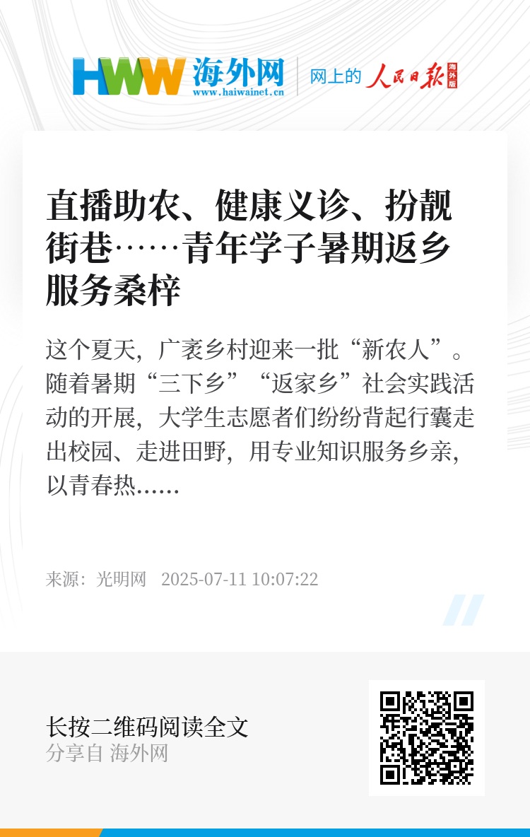 这个夏天,广袤乡村迎来一批“新农人”。随着暑期“三下乡”“返家乡”社会实践活动的开展,大学生志愿者们纷纷背起行囊走出校园、走进田野,用专业知识服务乡亲,以青春热情扮靓家乡。他们来到田间地头帮乡亲直播带货,他们走进街巷为房屋创作墙绘,他们还为老人义诊并建立健康档案……在火热的基层实践中,大学生志愿者既为乡村振兴注入青春活力,也在广袤天地间书写着新时代青年的责任担当。这里也成为青年学子成长的舞台,他们将积累实践经验,提升就业能力,为未来实现青春梦想积蓄力量。