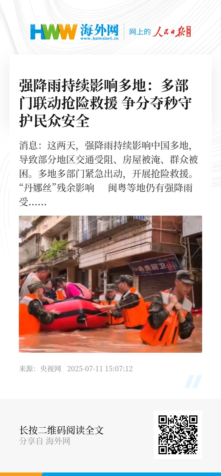 央视网消息:这两天,强降雨持续影响中国多地,导致部分地区交通受阻、房屋被淹、群众被困。多地多部门紧急出动,开展抢险救援。